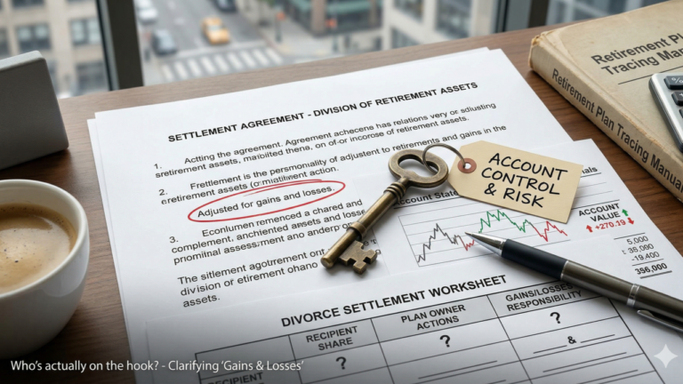 Between the date of settlement and the date the QDRO is actually processed and accepted by the plan, time passes. Sometimes a lot of it. During that window, the account can change significantly — through market movement, through the plan owner’s investment decisions, through withdrawals or loans — and the agreement as written may not address who bears the consequences of any of those changes.